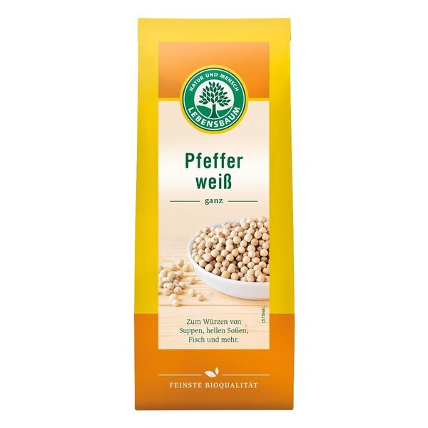 Piperul alb bio Lebensbaum se caracterizeaza prin aromele sale usoare. Piperul alb proaspat macinat nu trebuie sa lipseasca în niciun sos bechamel dar este la fel de potrivit pentru carne de pasare sau peste. Se foloseste pentru a condimenta supe, peste si sosuri albe.
