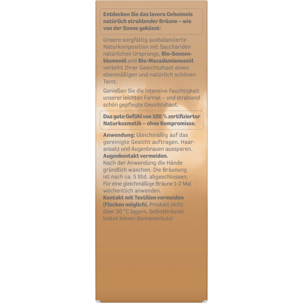 Un produs din ingrediente sanatoase pentru un bronz 100% natural, fara expunere la soare! Crema autobronzanta Lavera confera un glow sanatos si un bronz uniform, fara pete. Contine ulei de macadamia pretios, lasand pielea fina si hidratata pana la 24H.