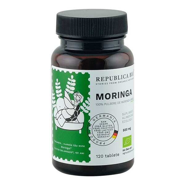 • Moringa bio este un supliment nutritiv certificat ecologic, produs in Germania • Supliment nutritiv ecologic natural, Raw, verificat si certificat Vegan, Fara Gluten, Fara Lactoza, Fara Fructoza, Fara Organisme Modificate Genetic nonGMO, Neiradiat si Neradiat. • Flaconul dublu sigilat contine 120 de tablete de 400 mg cu pulbere de Moringa din Israel.• Moringa este un superaliment care ajuta la echilibrarea nivelului de glucoza din organism regleaza gicemia. Proprietati• Ajuta la reglarea nivelului glicemiei, prin mentinerea unui nivel normal de glucoza. • Tonic general care sustine sanatatea organismului, datorita continutului de vitamine si minerale. Continut• Un flacon contine 120 tablete de 500 mg cu pulbere de Moringa din Israel, produs certificat ecologic cu certificarea DE – OKO – 007.• Ingrediente tableta 100% pulbere din frunze de Moringa Moringa oleifera 500mg*. *agricultura ecologica.• Tara de orgine este Israel. Consum• Mod de utilizare ca supliment alimentar, cate 1 tableta, de 3 ori pe zi, in cure de 3 - 6 luni.• Nu administrati copiilor sub 16 ani, femeilor insarcinate sau celor care alapteaza.• Pastrati la temperatura camerei, la loc uscat, ferit de razele soarelui.• Nu lasati la indemana si la vederea copiilor mici.• Produsul nu este recomandat ca inlocuitor al unui regim alimentar variat si echilibrat si al unui mod de viata sanatos.• Nu depasiti portia zilnica recomandata.• Consumati, de preferinta, inainte de sfarsitul perioadei inscrise pe ambalaj. -Organic-Raw-Vegan-Fara gluten-Fara lactoza-Fara fructoza-Fara GMO-Neradiat-Neiradiat