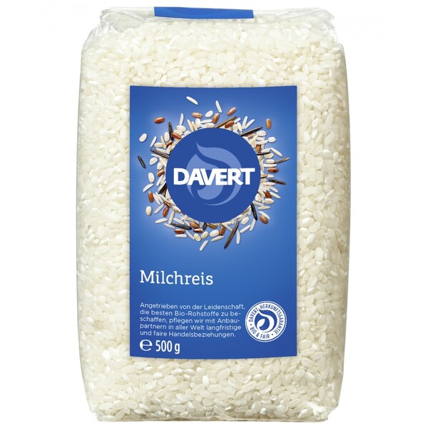Davert Milchreis este un orez organic pentru orez cu lapte. Asa se face clasicul orez cu lapte, la fel ca pe vremea bunicii. Variatiile cu scortisoara, dar si cu sosuri sau fructe sunt pur si simplu delicioase. Acest tip de orez se face prin macinarea si lustruirea orezului brun. Produs organic daSigiliul de stat Bio-Siegel, Bio-Logo UEAdaugarea la tara a siglei UE Agricultura italianaCorp de control ecologic DE-ÖKO-001Alte criterii de calitate si etichete societatea vegana, Interseroh - facuta pentru reciclare