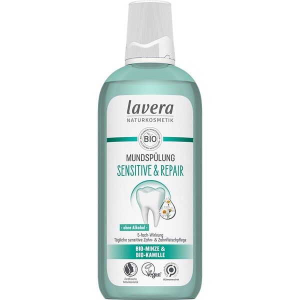 Apa de gura sensitive cu menta si musetel Lavera, prospetime naturala pentru dinti bine îngrijiti. Fara alcool si cu fluor pentru ingrijirea zilnica a dintilor si gingiilor.