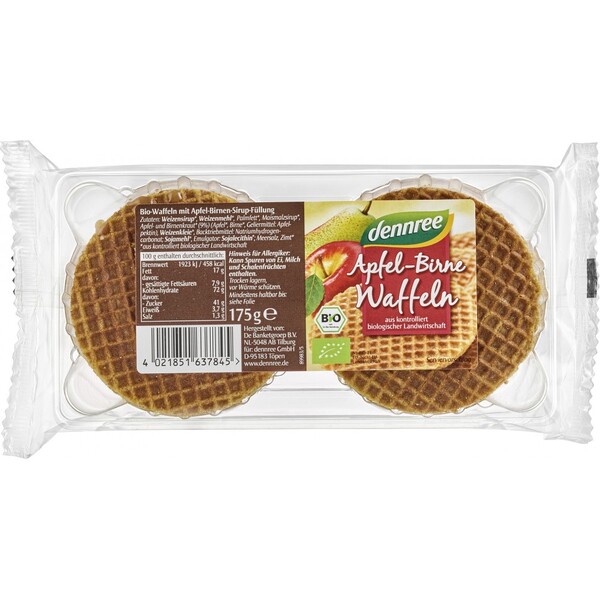 Vafele bio cu mere si pere ofera placere pura. Vafele maro auriu sunt coapte din cele mai bune ingrediente organice si rafinate cu o delicioasa umplutura organica de mere si sirop de pere. Aceasta specialitate este ideala cu ceai si cafea sau ca o gustare între mese. Bucurati-va de gustul aromat de mere si pere.