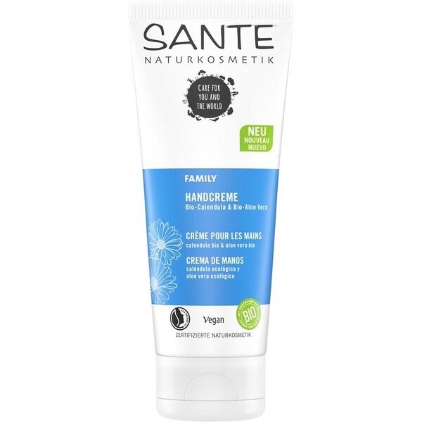 Crema de mâini Sante Family cu galbenele si Aloe Vera organica. Are grija de mâinile uscate. Ofera umiditate intensa si protejeaza împotriva uscarii. Se absoarbe rapid fara a se lipi. Pentru mâini catifelate, moi, bine îngrijite. Parfum pur natural.