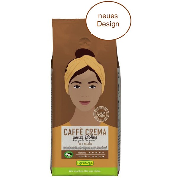 Boabe de cafea bio, prajite. Boabe de cafea 100% Arabica - produsa în conformitate cu criteriile de comert echitabil de catre partenerii Rapunzel HAND IN HAND. Procesul de prajire blând, întunecat pe termen lung produce o crema deosebit de catifelata si o aroma bine echilibrata. Caffè Crema este potrivit pentru aparatele de cafea complet automate. De asemenea, minunat ca espresso sau cafea „Schümli”.