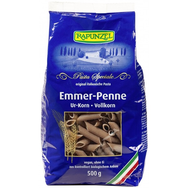 Tuburi scurte cu striatii fine si capete tesite. Paste - de calitate emmer cu un gust fin de nuci. Boabele integrale Rapunzel Emmer-Penne sunt fabricate din gris de grâu integral. Bucurati-va de paste împreuna cu prietenii si întreaga familie