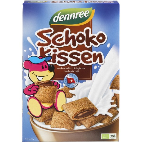 Pernitele de ciocolata ecologice ofera o placere pura. Pernitele de ciocolata Dennree sunt fabricate din cereale organice valoroase si sunt umplute cu o crema delicioasa de ciocolata, fabricata din ciocolata ecologica elvetiana topita autentica. Înmuiate în lapte rece, ele sunt o masa gustoasa pentru micul dejun sau între mese. Dar, de asemenea, pure pernitele de ciocolata sunt un desert irezistibil pentru toate vârstele. Bucurati-va de gustul crocant si de ciocolata.