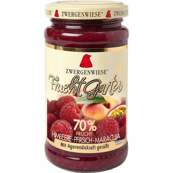 Gem de zmeura bio, piersici si maracuja indulcit cu nectar de agave FARA ZAHAR cu un continut de fructe de 70%, este facut din fructe selectate, coapte la soare, într-un proces delicat, în cantitati mici. Dulceata naturala a fructelor ecologice este completata cu sirop de agave valoros. Cu 18 soiuri, gradina noastra de fructe îndulceste în mod natural micul dejun, deserturi si multe altele, torturi, lapte, înghetata s.a. Origine si calitateTara de procesare GermaniaProdus organic daSigiliul de stat Bio-Siegel, Bio-Logo UEAdaugarea la tara a siglei UE Agricultura UE agricultura non-UECorp de control ecologic DE-ÖKO-005Ce standard este îndeplinit Standardul CEE 8342007Alte criterii de calitate si etichete Logo-ul fara gluten a DZG