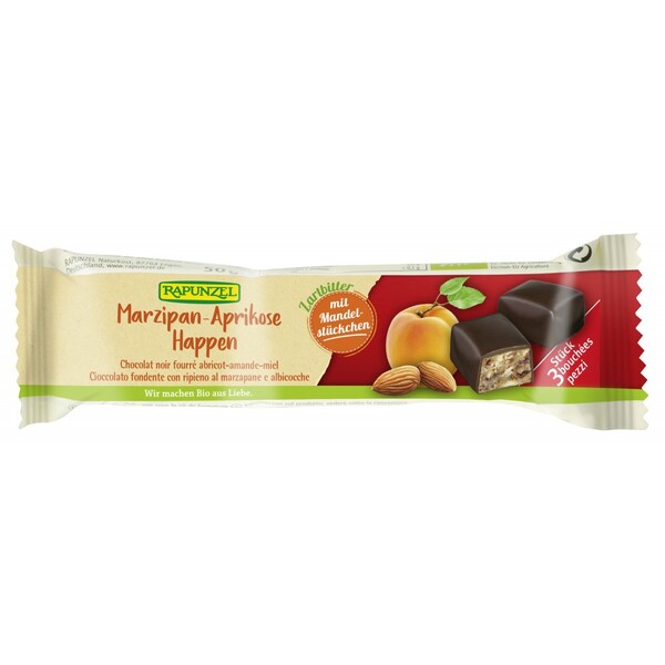 Martipan de miere * 30,00% migdale * 53,00%, miere *, ciocolata amaruie* 25,00% zahar din trestie de zahar *, masa de cacao *, unt de cacao *, caise uscate * caise *, faina de orez *, migdale* prajite 23,00%. * ingrediente provenite din agricultura ecologica