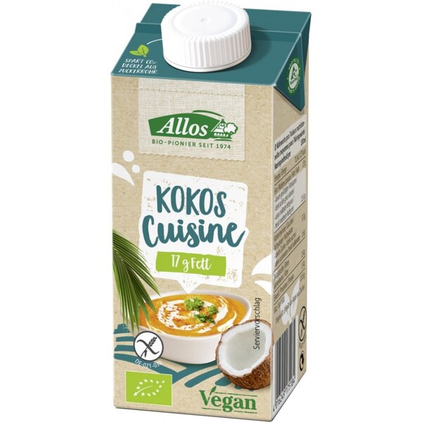 Noile alternative de lapte Allos asigura o placere echilibrata. Bauturile pure de legume sunt o alternativa sanatoasa la lapte si sunt, de asemenea, potrivite pentru rafinarea preparatelor de copt si fierbere. Diferitele soiuri ofera un sortiment variat care contine cel mai bun lucru pentru fiecare gust. Alternativa crema pe baza de nuca de cocos este deosebit de potrivita pentru gatit si coacere. Cu aceasta crema bio de nuca de cocos puteti sa rafinati sosuri, supe, gratinuri, paste si prajituri - desigur si preparate vegetale sau deserturi. Crema de nuca de cocos este foarte gustoasa si digerabila, deoarece este în mod natural fara lactoza. DepozitareA se pastra la frigider dupa deschidere si se utilizeaza în termen de 3-4 zile. Origine si calitateTara Regiunea de origine Ingrediente principale diferite tariProdus organic daPonderea ingredientelor organice 100% organicSigiliul de stat Sigla organica a UEAdaugarea la tara a siglei UE Nu agricultura UECorp de control ecologic IT-BIO-006Ce standard este îndeplinit Standardul CEE 8342007Alte criterii de calitate si etichete Spicul de grâu fara gluten de la DZG