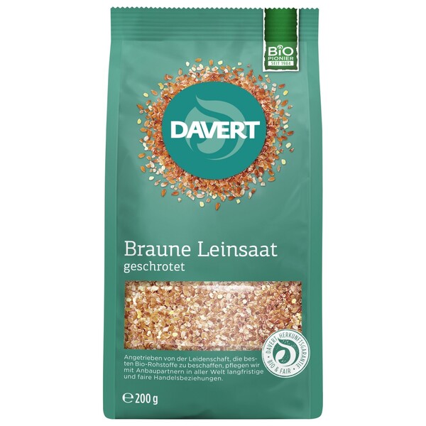 Seminte de in brun bio zdrobite Davert. Pot fi consumate fara sa fie înmuiate. Cu un gust blând, de nuca, pot fi combinate în mai multe moduri se amesteca în piureuri, sucuri de fructe, supe, muesliuri si sosuri. Pe deasupra quarkului, pâinii sau salatelor de fructe. Pentru coacere, înlocuiti o mica parte din faina cu seminte de in bio. Produs organic daSigiliul de stat Bio-Siegel, Bio-Logo UEAdaugarea la tara a siglei UE Agricultura indianaCorp de control ecologic DE-ÖKO-001Alte criterii de calitate si etichete societatea vegana