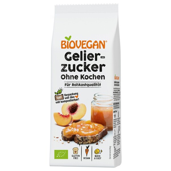 Cu Biovegan zahar gelifiant fara a fierbe, pot fi procesate rapid si usor fructe proaspete si fructe congelate rezultand o pasta plina de vitamine care isi pastreaza gustul de fructe. Gustul neîntrecut si neadulat al fructelor proaspete iese în mod deosebit si face ca acest lucru sa raspândeasca o experienta de gust Se realizeaza rapid si în siguranta. Pregatita în doar 1 minut cu blenderul Continut 115 g pentru 250 g fructe Mod de preparare pentru 250g fructe 1.Se spala fructele dupa care se lasa la scurs si se inlatura samburii si se taie in bucati. Se cantaresc 250g. 2.Se pun fructele bio intr-un vas si se amesteca cu continutul plicului. Daca fructele sunt mai dulcide exemplu afine, se mai adauga 2 lingurite de suc de lamaie. 3. Cu ajutorul unui mixer sau mecanic se vor mixa timp de 1 minut. 4. Se toarna pireul de fructe ecologice in pahare curate, care se introduc in frigider, unde se lasa 1 ora. Dupa ce se scot din frigider se poate ca pireul sa fie mai tare. Consistenta pireului este data de felul fructelor folosite.